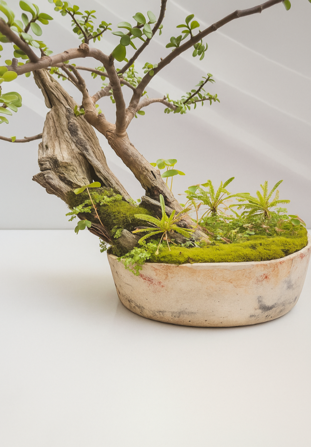 Esta línea de bonsáis va más allá del árbol: integra piedras, raíces o fragmentos de madera que recrean pequeños paisajes armónicos y orgánicos.